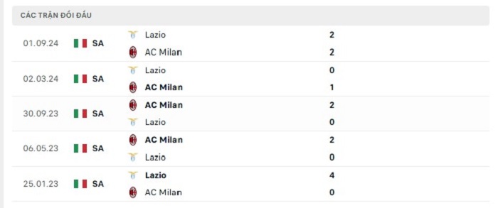 Bảng bóng đá trận đấu AC Milan vs Lazio