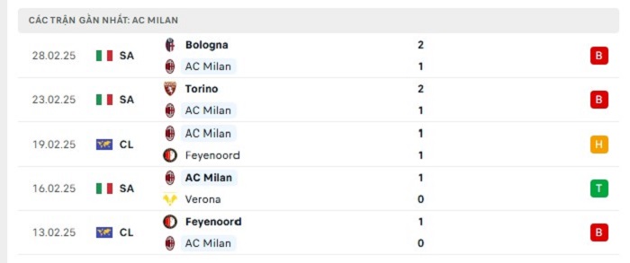 Phong độ gần đây AC Milan vs Lazio