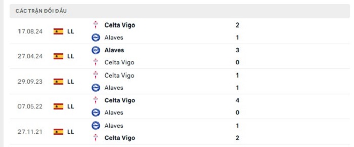 Lịch sử đối đầu của Alaves vs Celta Vigo