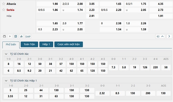 Bảng tỷ lệ kèo bóng đá trận đấu Albania vs Serbia