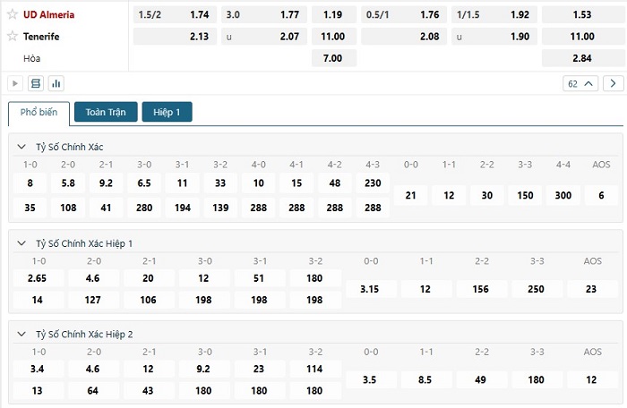 Bảng tỷ lệ kèo bóng đá trận đấu Almeria vs Tenerife