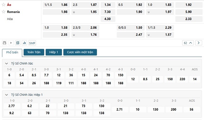 Soi kèo châu Á, kèo chấp Áo vs Romania