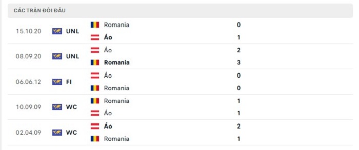 Lịch sử đối đầu của Áo vs Romania