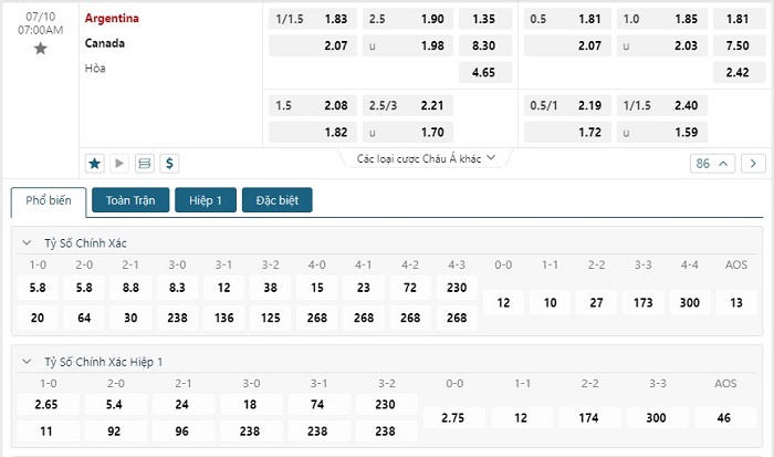 Bảng tỷ lệ kèo bóng đá trận đấu Argentina vs Canada