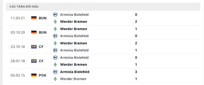 Lịch sử đối đầu của Arminia Bielefeld vs Werder Bremen