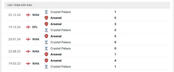 Lịch sử đối đầu của Arsenal vs Crystal Palace
