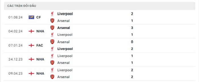 Lịch sử đối đầu của Arsenal vs Liverpool