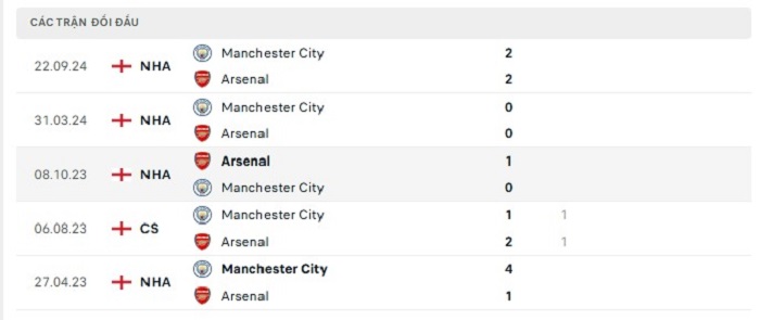 Lịch sử đối đầu của Arsenal vs Manchester City
