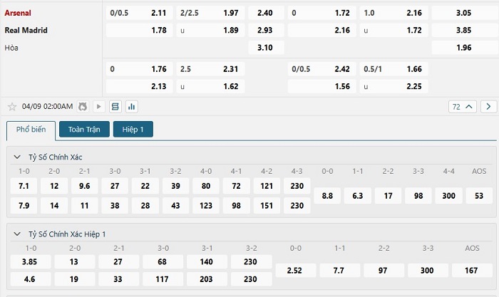Bảng tỷ lệ kèo bóng đá trận đấu Arsenal vs Real Madrid