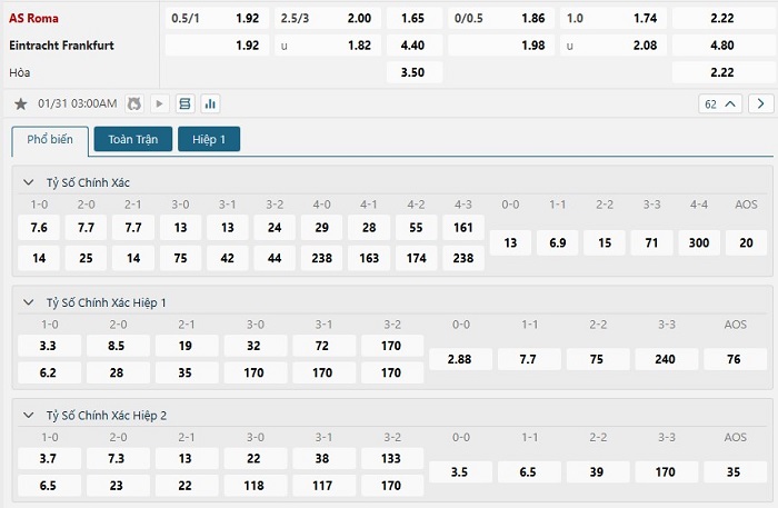 Soi kèo tỷ số AS Roma vs Eintracht Frankfurt