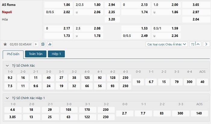 Soi kèo châu Á, kèo chấp AS Roma vs Napoli