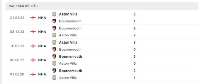 Lịch sử đối đầu của Aston Villa vs Bournemouth
