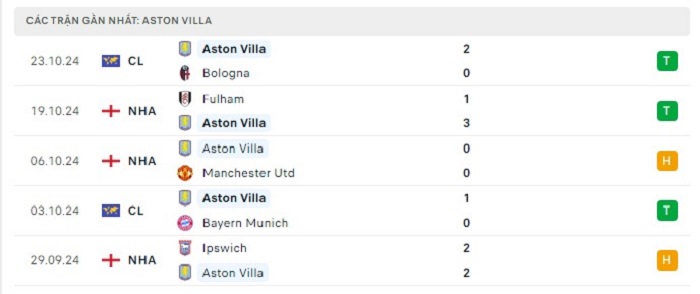 - Phong độ Aston Villa
