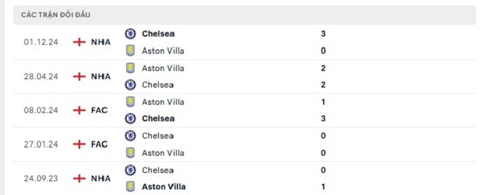 Lịch sử đối đầu của Aston Villa vs Chelsea