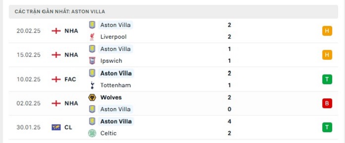 - Phong độ Aston Villa