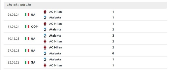 Lịch sử đối đầu của Atalanta vs AC Milan