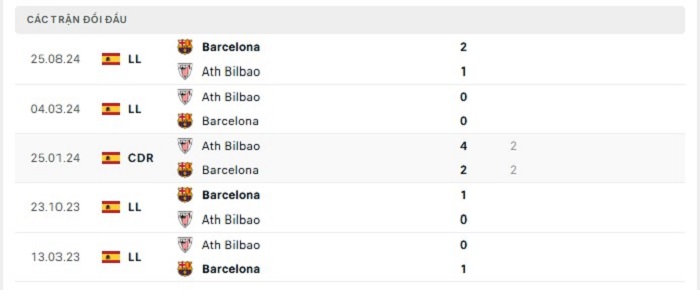 Bảng bóng đá trận đấu Athletic Bilbao vs Barcelona