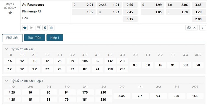 Bảng tỷ lệ kèo bóng đá trận đấu Atl Paranaense vs Flamengo