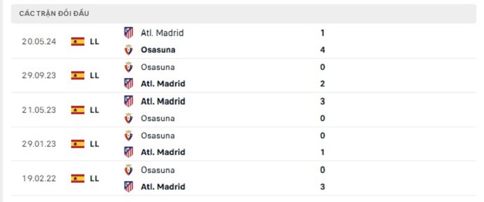 Lịch sử đối đầu của Atletico Madrid vs Osasuna