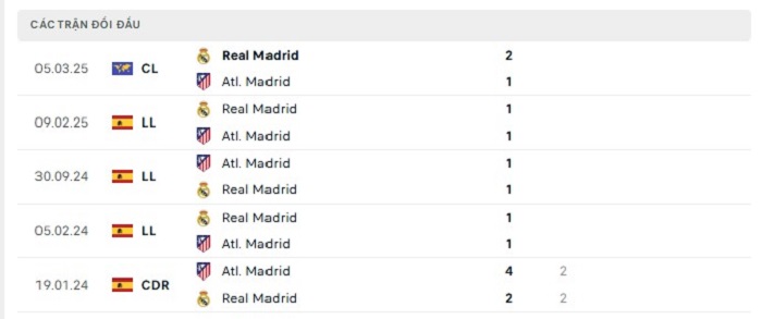 Lịch sử đối đầu của Atletico Madrid vs Real Madrid