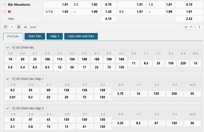 Bảng tỷ lệ kèo bóng đá trận đấu Bắc Macedonia vs Bỉ