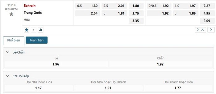 - Bahrain 2-0 Trung Quốc (H1)