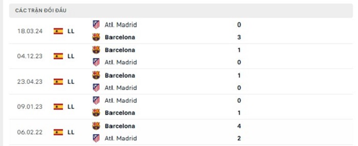Bảng  bóng đá trận đấu Barcelona vs Atletico Madrid