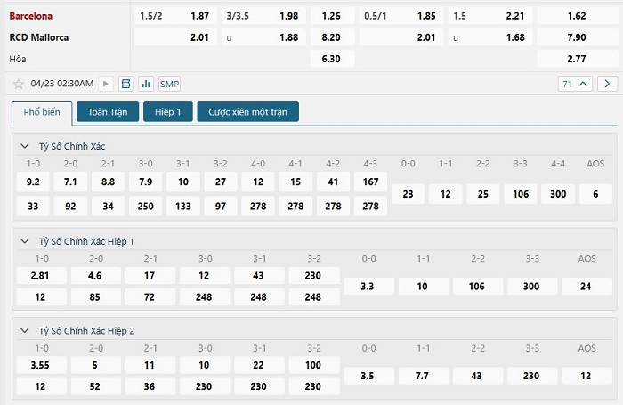 Bảng tỷ lệ kèo bóng đá trận đấu Barcelona vs Mallorca