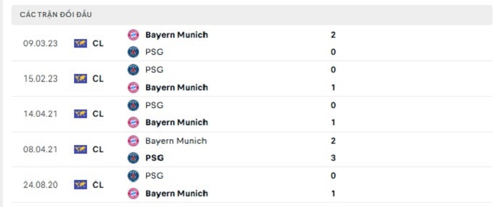 Bảng bóng đá trận đấu Bayern Munich vs Paris Saint Germain