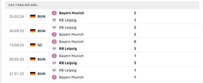 Lịch sử đối đầu của Bayern Munich vs RB Leipzig