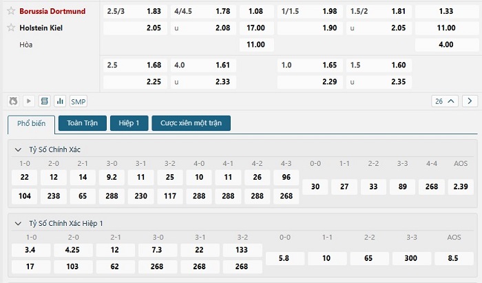 Bảng tỷ lệ kèo bóng đá trận đấu Borussia Dortmund vs Holstein Kiel