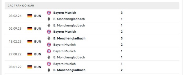 Bảng  bóng đá trận đấu Borussia M’gladbach vs Bayern Munich