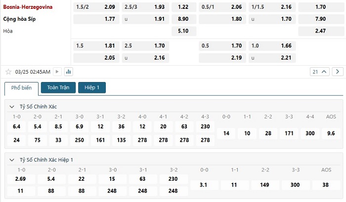 Bảng tỷ lệ kèo bóng đá trận đấu Bosnia & Herzegovina vs Đảo Síp