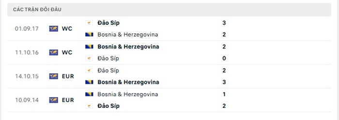 Lịch sử đối đầu của Bosnia & Herzegovina vs Đảo Síp