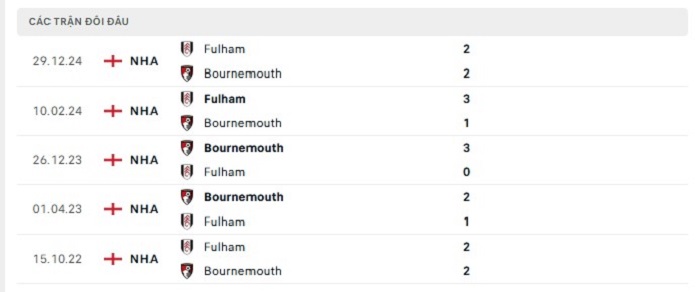 Lịch sử đối đầu của Bournemouth vs Fulham