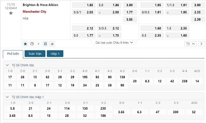 Brighton mặc dù có được những tiến bộ trong các năm gần đây nhưng so với Manchester City thì họ vẫn còn thua kém rất nhiều, cụ thể là là 10 lần gặp nhau gần đây nhất của hai đội Brighton chỉ có được 1 trận thắng và 1 trận hoà trong khi có tới 8 thất bại theo kèo châu Âu trước Manchester City, điều này cũng có thể thấy được sự chênh lệch khá lớn của hại đội ở thời điểm hiện tại, chính bởi lý do này mà có thể đặt niềm tin vào Manchester City trên phương diện kèo châu Âu của trận đấu sắp tới.