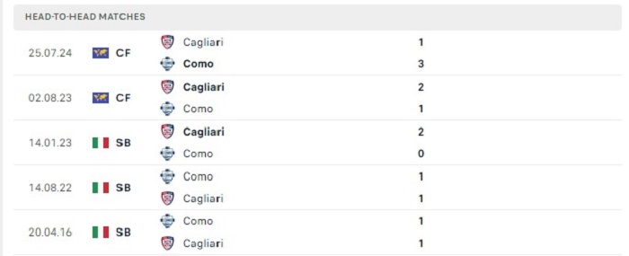 Trong 2 lần gặp nhau gần nhất giữa Cagliari và Como đều có tỷ lệ ghi bàn tương đối cao trong trận, điều này có thể nhận thấy được lối chơi mà hai đội tạo ra được đang có được sự phóng thoáng hơn trước. Hàng thủ của Como tại giải đấu cũng đang cho thấy những mặt yếu kém khi nhận tới 3 bàn thua tại vòng đấu vừa qua của mình. Vì vậy mà có thể kỳ vọng vào một trận đấu bùng nổ về mặt tỷ số của cả hai đội sắp tới.