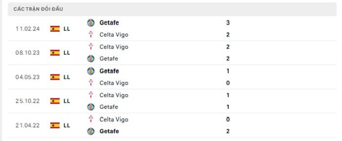 Lịch sử đối đầu của Celta Vigo vs Getafe