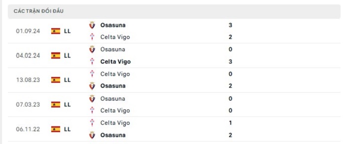 Lịch sử đối đầu của Celta Vigo vs Osasuna