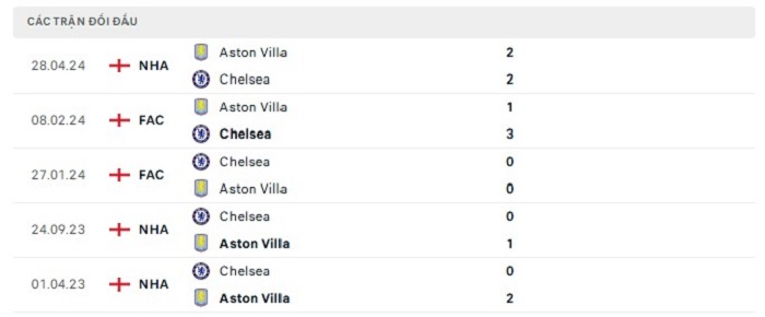 Lịch sử đối đầu của Chelsea vs Aston Villa