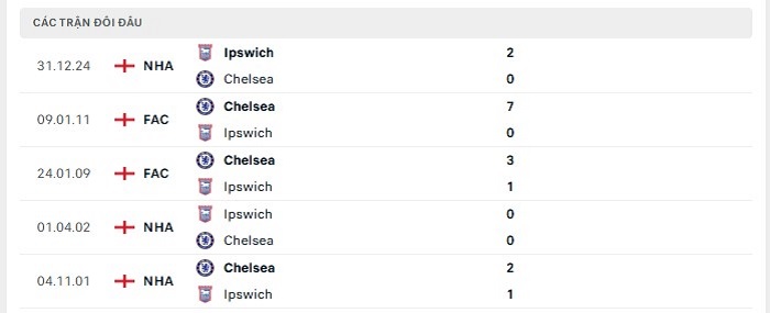 Lịch sử đối đầu của Chelsea vs Ipswich