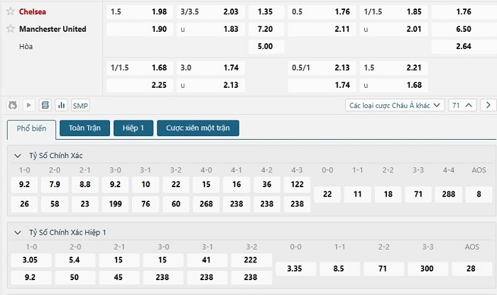 Bảng tỷ lệ kèo bóng đá trận đấu Chelsea vs Manchester United