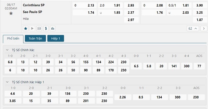 Bảng tỷ lệ kèo bóng đá trận đấu Corinthians vs Sao Paulo