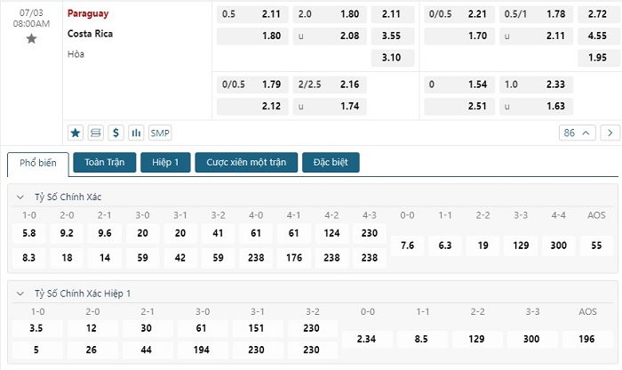 Bảng tỷ lệ kèo bóng đá trận đấu Costa Rica vs Paraguay