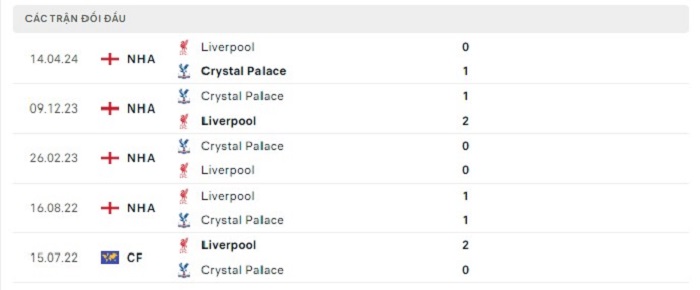 Phong độ gần đây Crystal Palace vs Liverpool