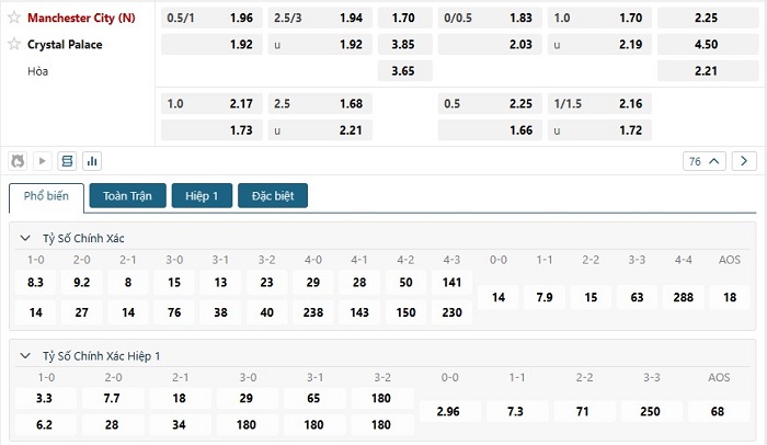 Bảng tỷ lệ kèo bóng đá trận đấu Crystal Palace vs Manchester City