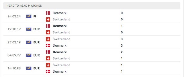 Giữa Đan Mạch và Thụy Sĩ vốn cũng khá cân bằng với nhau trước đây, dù trong 5 trận gặp nhau gần nhất Thụy Sĩ vẫn chưa đáng bại được Đan Mạch nhưng họ cũng tạo nên không ít sóng gió cho đối thủ. Bằng chứng cụ thể là Đan Mạch chỉ thắng 2 trận đấu và có tới 3 trận đấu đã hoà kèo châu Âu trong những lần gặp nhau gần đây nhất của hai đội. Chính bởi vậy mà khả năng bất phân thắng bại của hai đội theo mốc kèo châu Âu của trận đấu cũng là khả thi hơn nhiều.