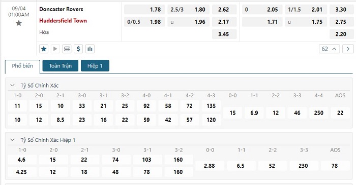Bảng tỷ lệ kèo bóng đá trận đấu Doncaster vs Huddersfield