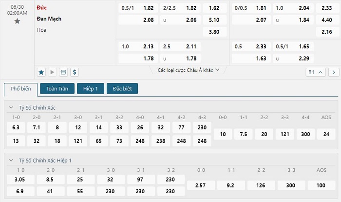 Bảng tỷ lệ kèo bóng đá trận đấu Đức vs Đan Mạch