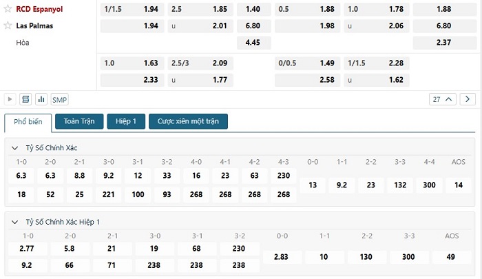 Bảng tỷ lệ kèo bóng đá trận đấu Espanyol vs Las Palmas